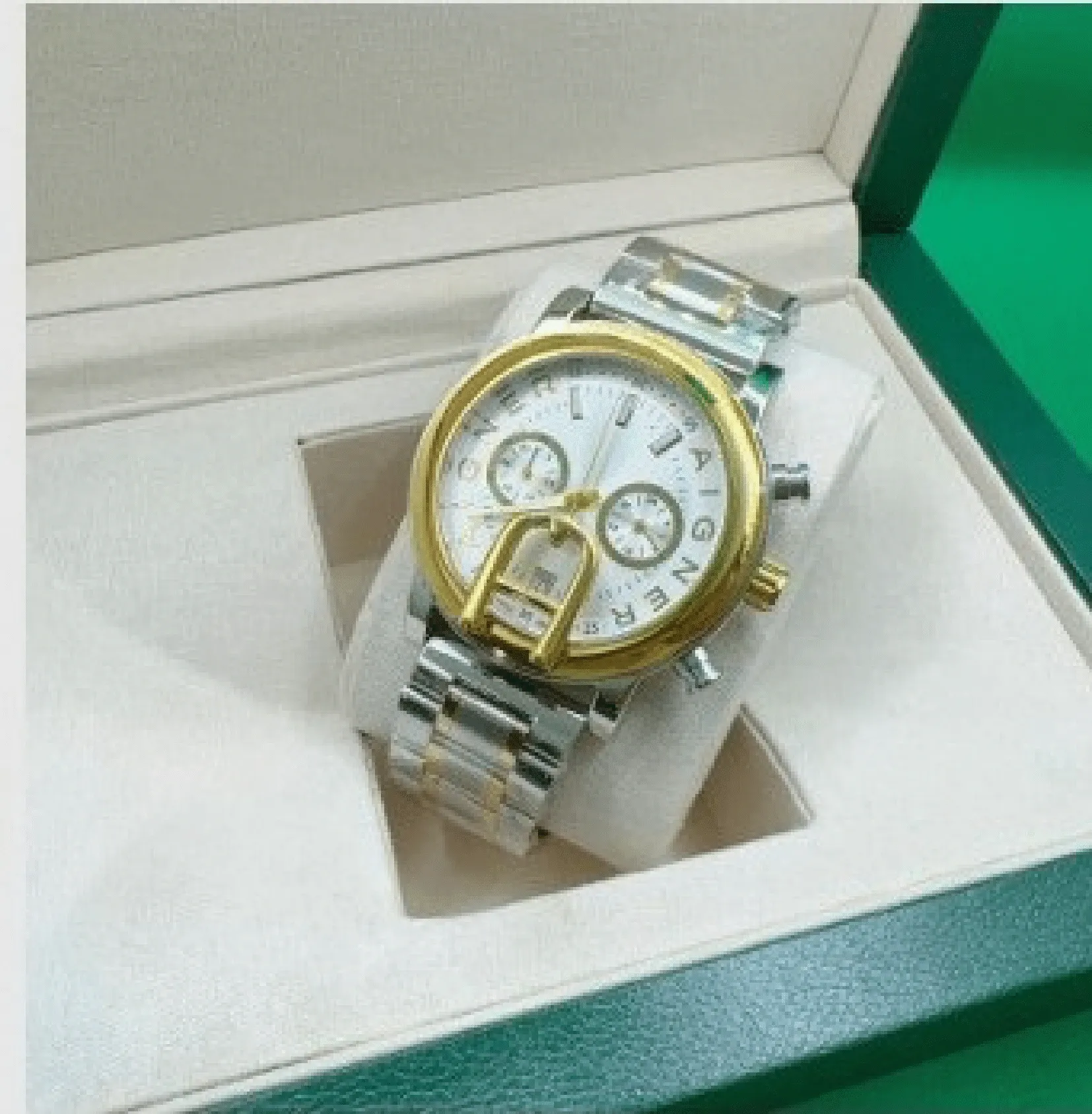 Aigner wristwatch is crafted from stainless steel with a case diameter of 44mm. It features a bulky and muscular case with a rounded silver dial detailed with silver-tone band label accents. It comes with two subdials, luminous hands, and a ta date window at the six o’clock position. It comes fitted with a leather strap and secured with buckle closure.