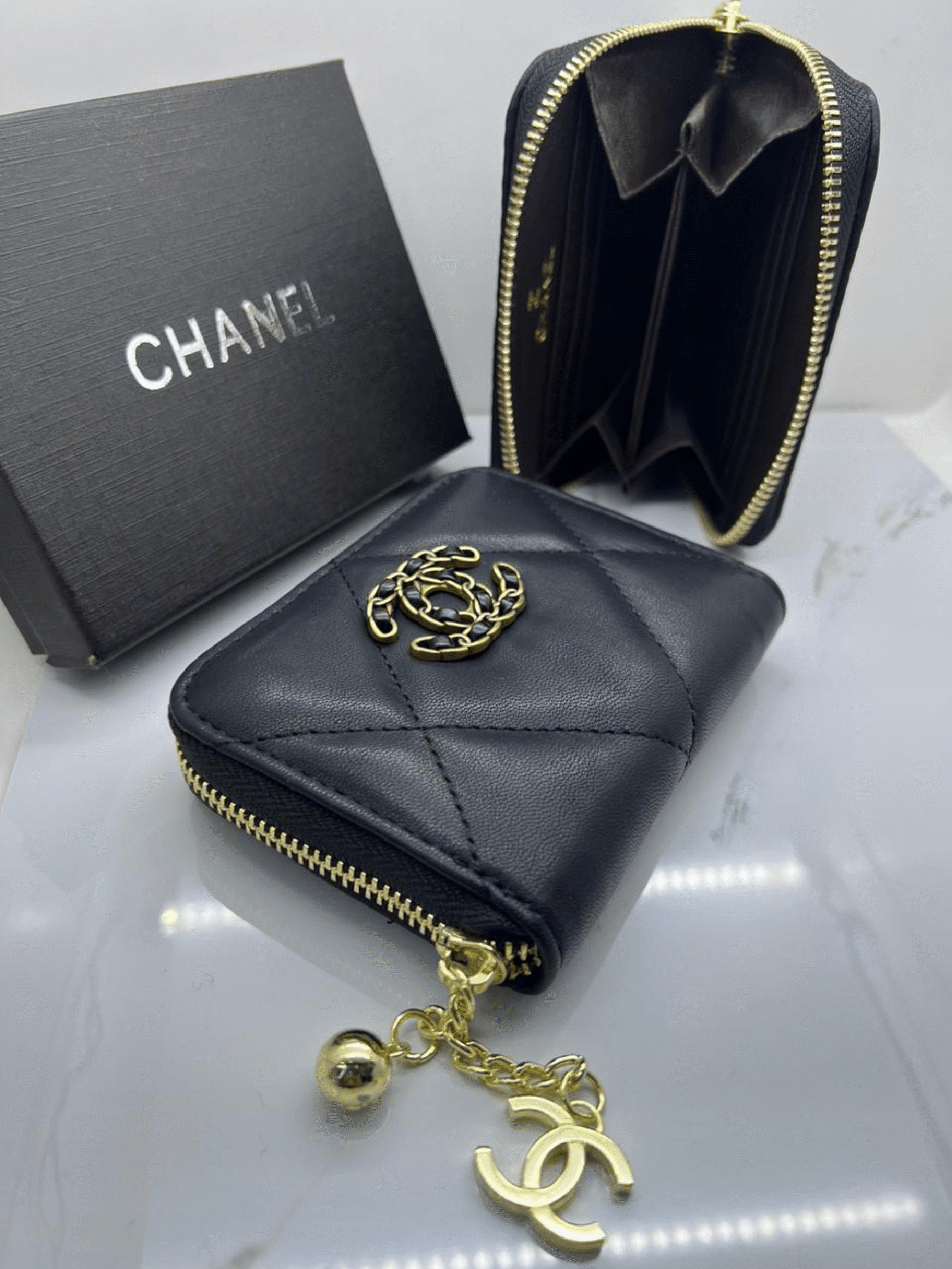 Crafted in quilted calfskin (available in grained caviar or smooth lambskin) with bold oversized CC and 19 hardware, the Chanel 19 zipped coin purse‑wallet offers a stylish twist on compact utility, featuring a zip-all-around closure, a back slip pocket, two flexible center compartments, and space for around 6–8 cards with a few folded bills or coins—perfect for everyday essentials in a chic, sophisticated mini silhouette.