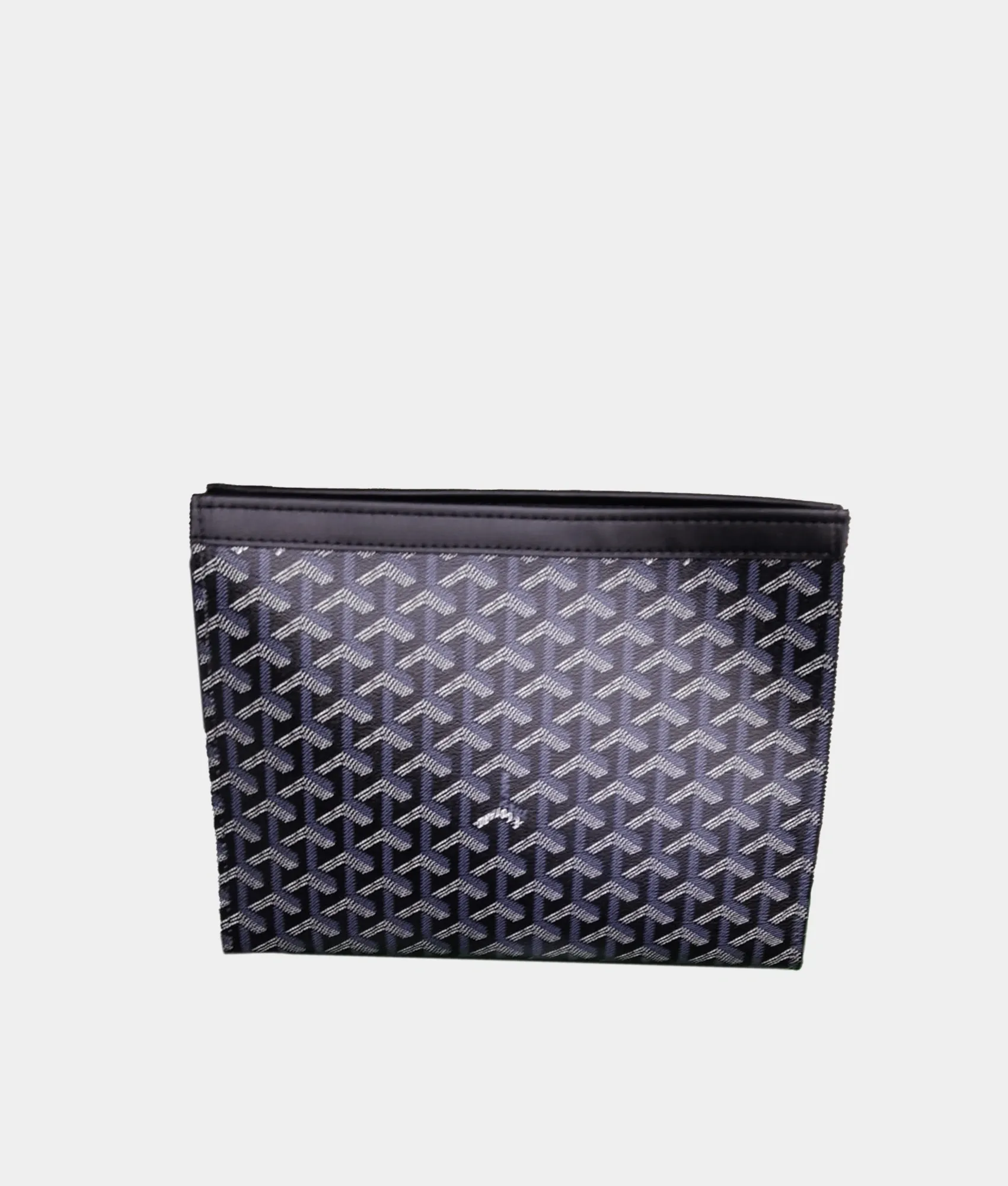 Unisex pouch in Goyardine coated canvas with Chevroches calfskin trim, palladium zipper, and interior card pocket. Measures 30 × 20 cm and weighs ~160g—perfect as clutch or organizer.