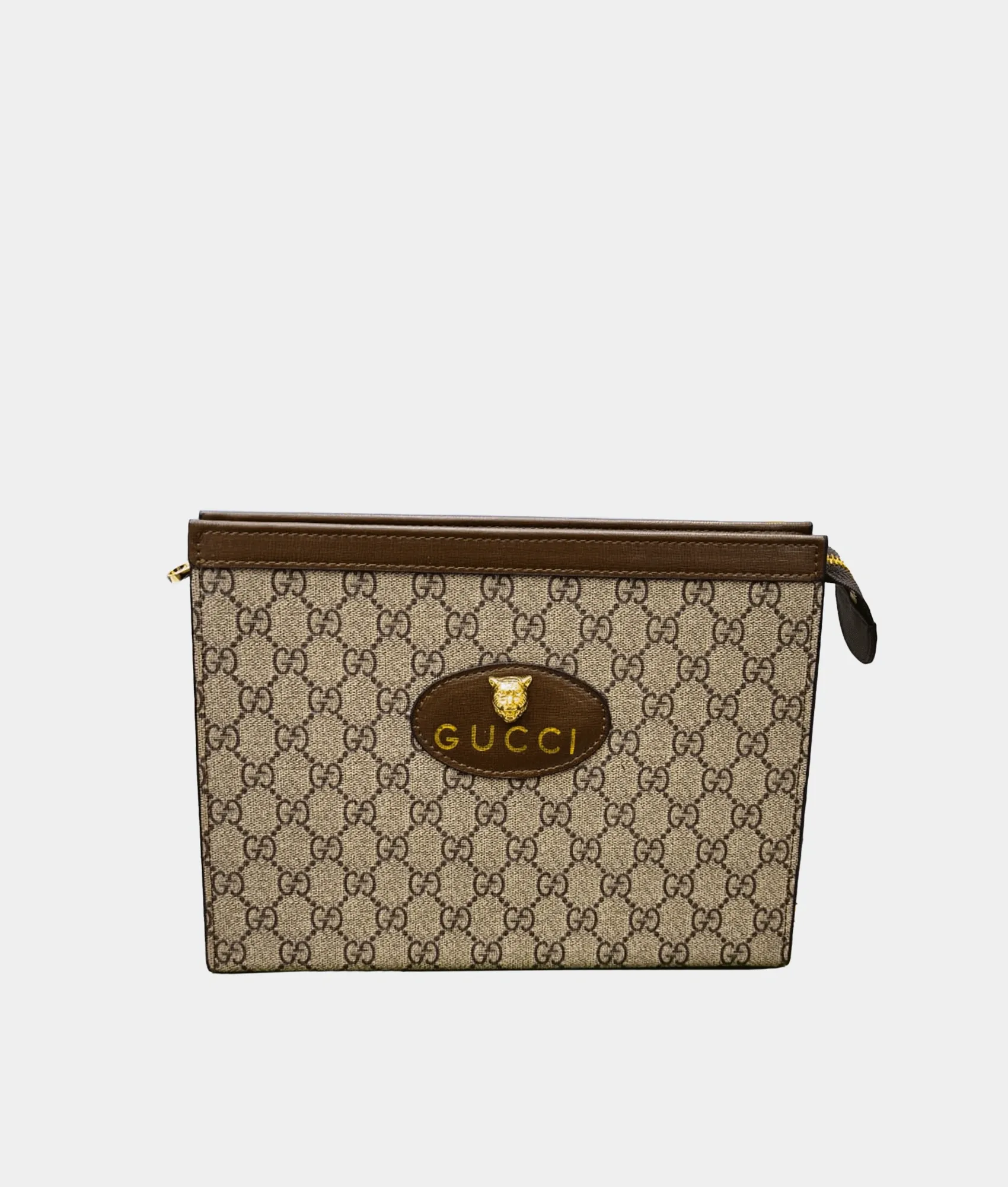 Limited-edition clutch featuring Supreme canvas with striking Jaguar motif, zip closure, and refined leather accents—designed for collectors.