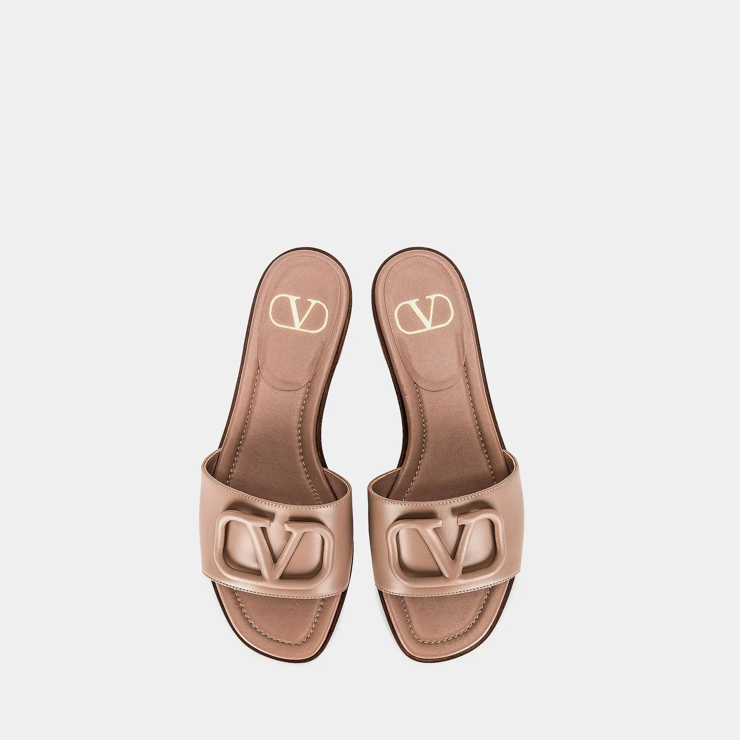 Leather slides embossed with Valentino’s oversized VLogo plaque atop cushioned soles—balancing understated femininity and logo appeal.