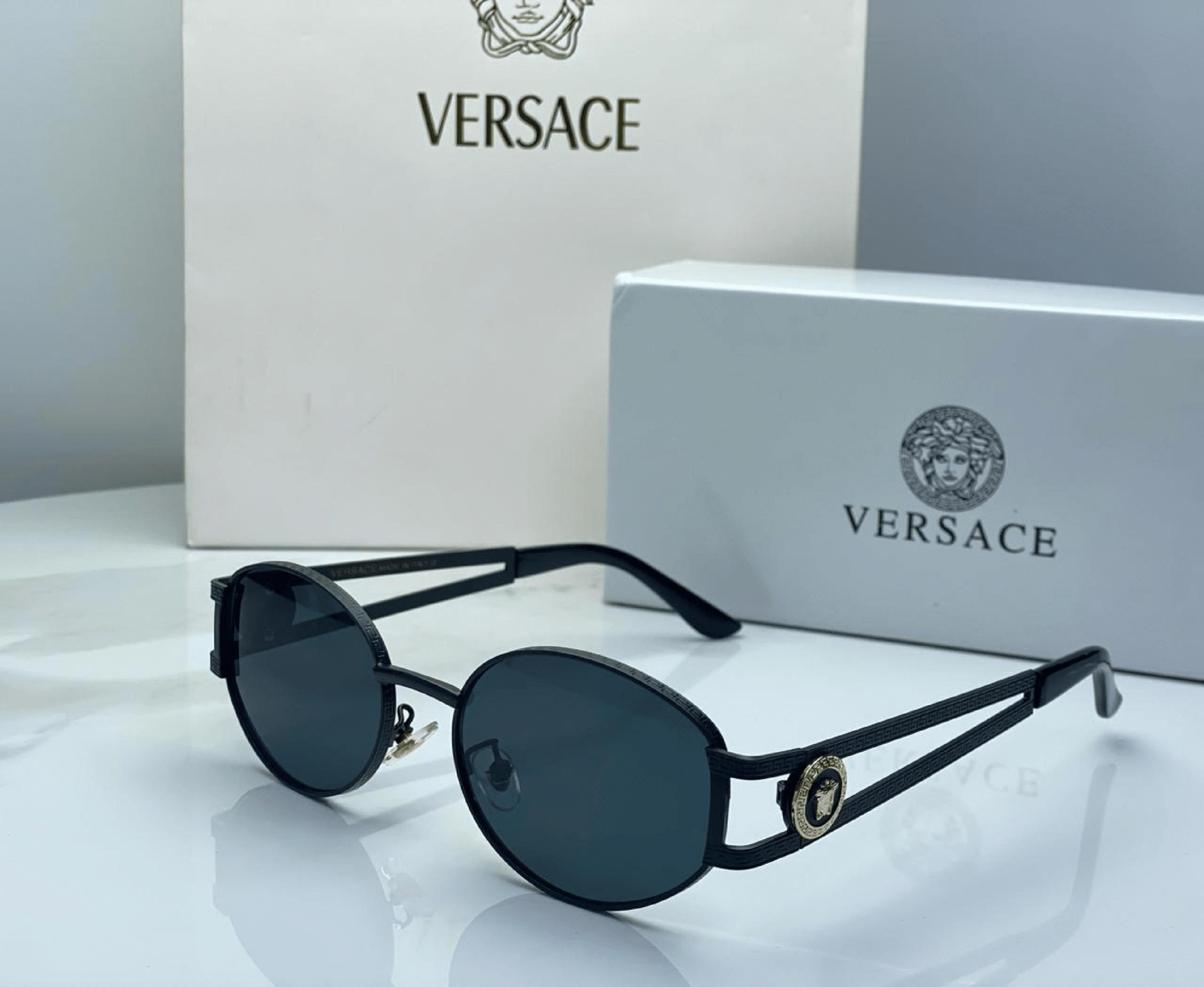 Versace Oval Metallic sunglasses exude bold luxury with their distinctive oval blue lenses and intricately engraved gold-tone frame. The signature Medusa medallion on the temples adds iconic Versace elegance. A striking blend of vintage charm and modern glamour, perfect for standout looks.