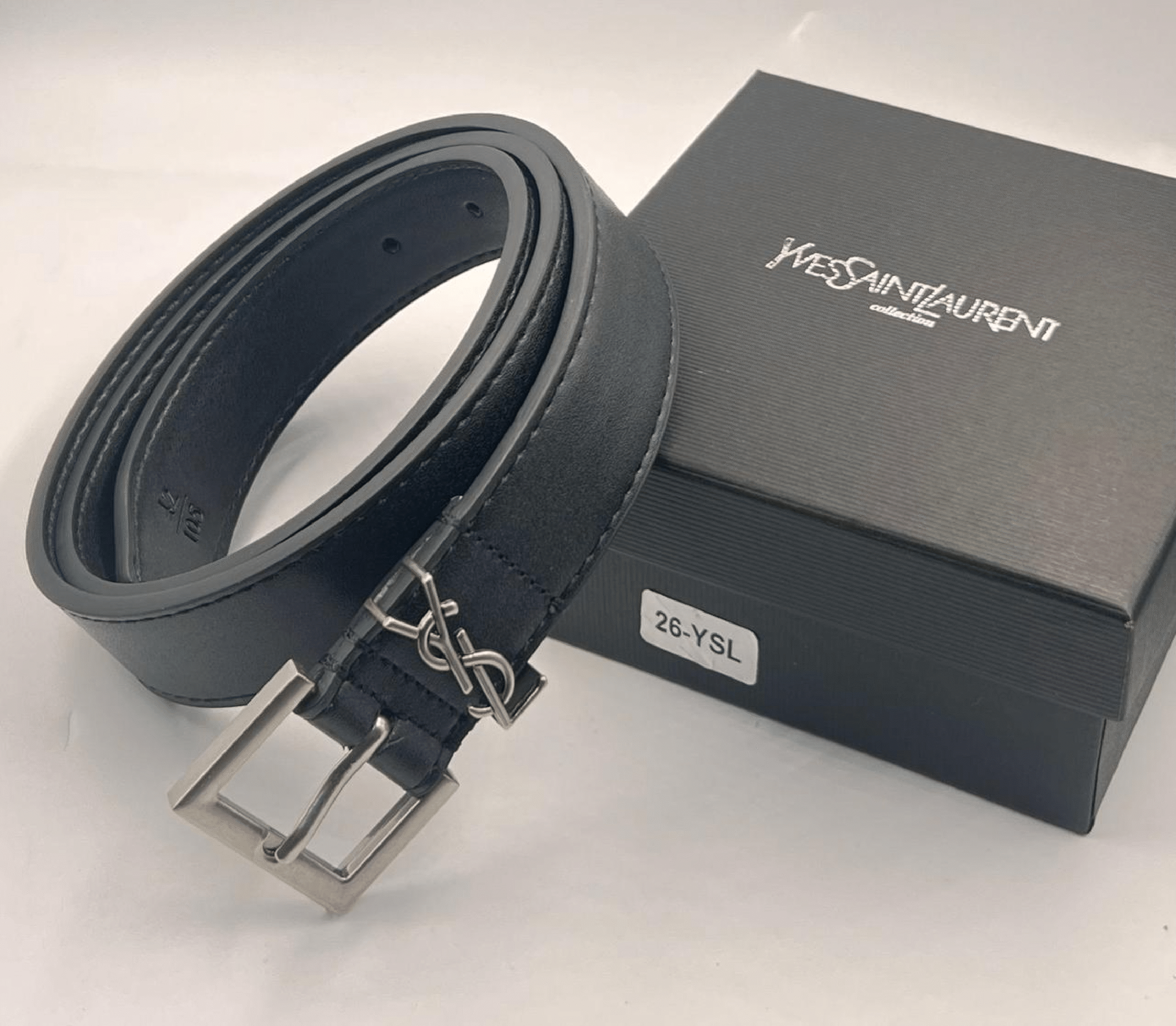 Crafted from smooth leather, it features the iconic YSL logo buckle in a refined metallic finish.